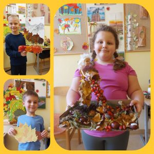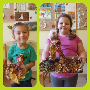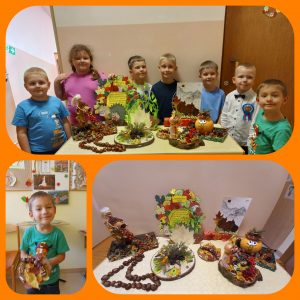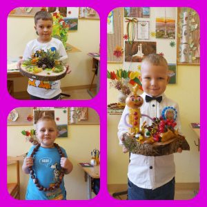 Mūsų mokykloje vyko nuostabi kūrybinių darbų paroda, skirta rudeniui. Vaikai kartu su tėveliais kūrė tikrus stebuklus iš gamtos dovanų. Jie iš kaštonų suvėrė spalvingus karolius, o iš gilių ir uogų sukomponavo lėlei Barbei ąsotį su tekančiu iš jo vandeniu. Ant stalo puikavosi linksmos vikšrų šeimynos, ežiukai miško takeliuose.