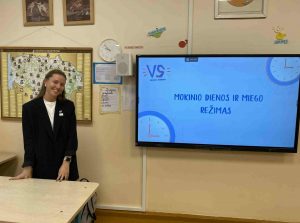 Mūsų mokykloje visuomenės sveikatos biuro specialistė Augustina Goštautaitė vedė dvi edukacijas: „Mokinio dienos ir miego režimas“ ir „Užsidėk tiesos akinius“ . Pirmasis užsiėmimas, kuris vyko spalio 7 d., buvo skirtas supažindinti mokinius su mokinio dienos ir poilsio režimo svarba ir pabrėžti jų įtaką mokymosi efektyvumui, sveikatai ir bendrai gerovei. Teorinėje dalyje aptarti pagrindiniai mokinio dienos režimo elementai, tokie kaip mokymasis, veikla, poilsis, mityba ir miegas. Praktinėje dalyje buvo atliekama užduotis: dienos ir poilsio režimo lavinimo kalendorius.