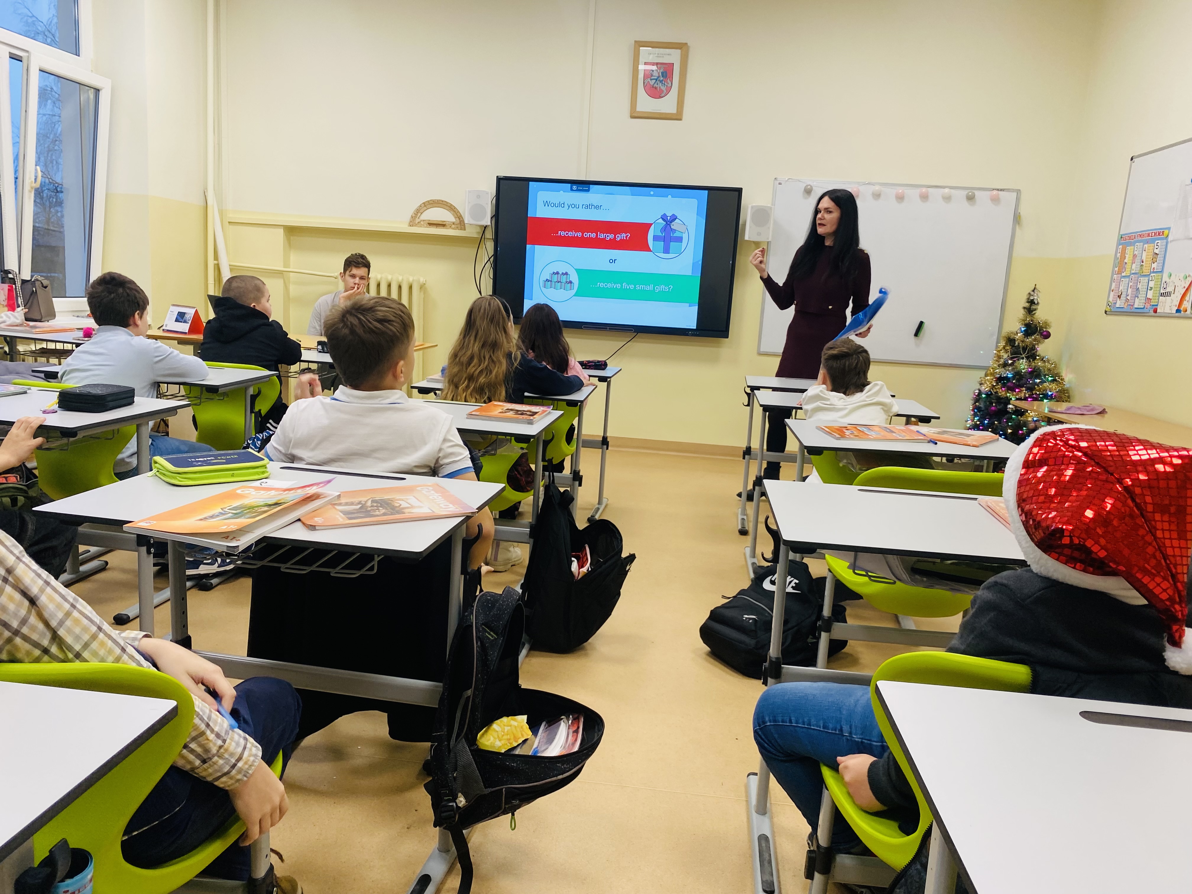 Kalėdos – tai stebuklingas laikotarpis. Gruodžio 15 dieną penktų klasių mokiniams vyko anglų kalbos kalėdinė viktorina „Christmas Quiz“. Tą dieną mokiniai sužinojo, kaip visame pasaulyje vadinamas Kalėdų senelis: Julinissen (Norvegijoje), Hoteiosho (Japonijoje) ir daug kitų pavadinimų. Be to, sužinojo, kodėl ir kada švenčiamos Kalėdos, koks maistas šią dieną gaminamas, kokios dovanos yra dovanojamos, kaip parašyti laišką Kalėdų seneliui, kokios dainos yra dainuojamos. Moksleiviai susipažino su nauja leksika. Taip pat atsakinėjo į įvairius klausimus apie Kalėdų senelį, dainavo dainas „Merry Christmas“, „Jingle Bells“. Šventė visiems patiko, mokiniai įgijo naujos patirties.