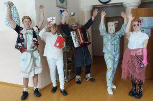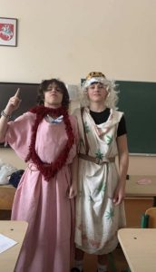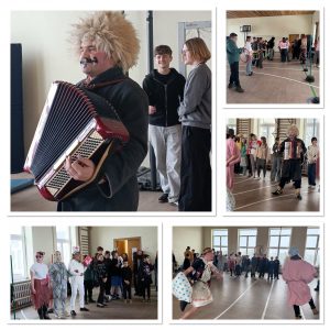 Todėl ir pamokos tądien buvo lengvesnės, integruotos, supažindinančios, su šia archaiška švente. Pagrindiniai šventės simboliai – persirengėliai, kaukės, blynai, Lašininio ir Kanapinio kova ir „žiemos varymas iš kiemo“. Šiemet ji arši, nenorėjo trauktis ir pagrumojo dar speigais. Šeštos pamokos metu visas persirengėlių būrys koridoriais, dainuodami „Kepė, kepė boba blynus“ dainą, patraukė į salę stebėti Lašininio ir Kanapinio dvikovos. Šie ne tik maišais daužėsi, bet kartu ir šoko, o vaikai traukė virvę ir varžėsi įvairiose rungtyse. Buvo žaidimų ir visokio kito triukšmo, kuris įmanomas tik per Užgavėnes. Galiausiai Lašininis buvo įveiktas, „žiema išvaryta“ ir visi mokiniai direktorės Jūratės Venciuvienės pakviesti leidosi į valgyklą ragauti blynų. „Buvo gera gaspadinė, gero vyro žmona…“