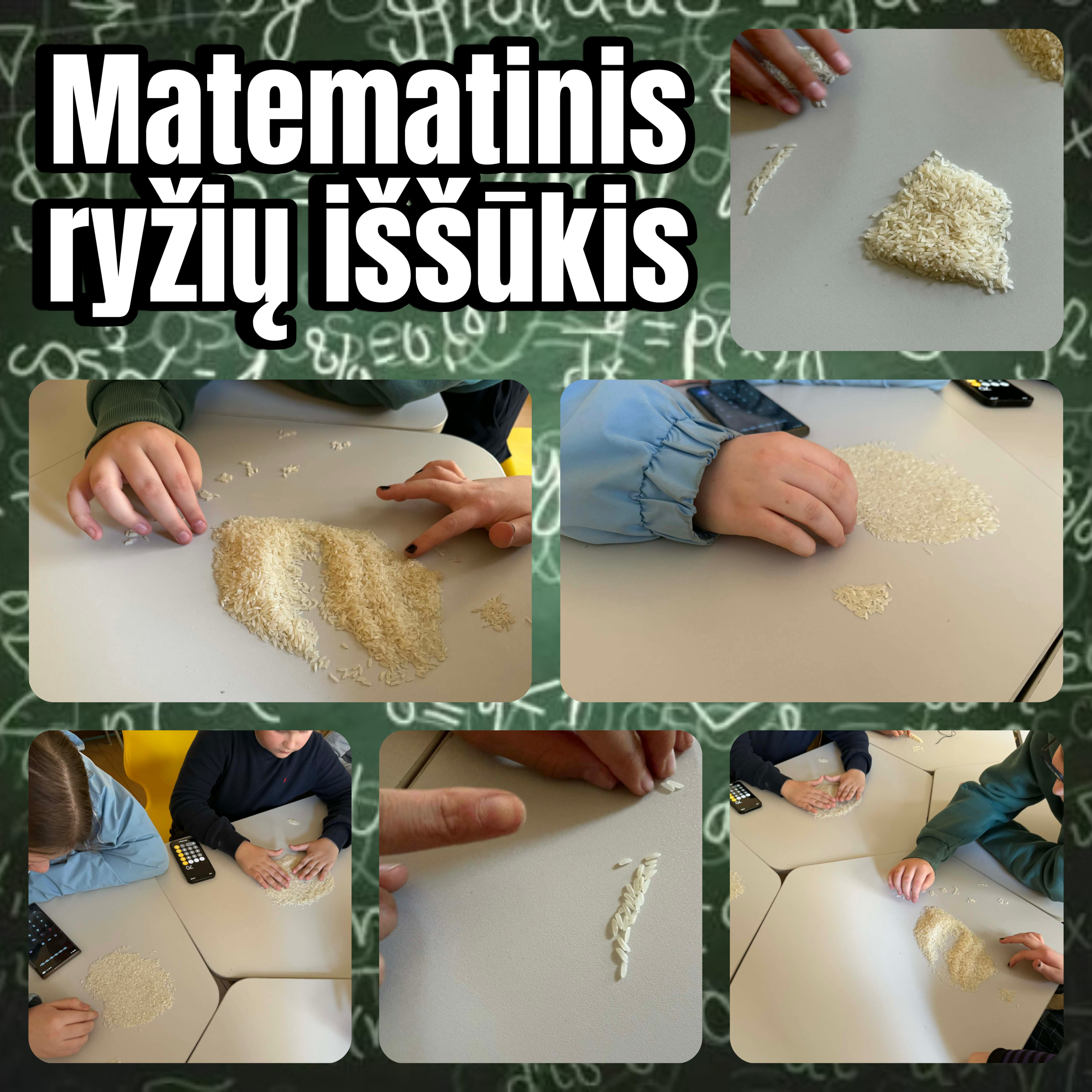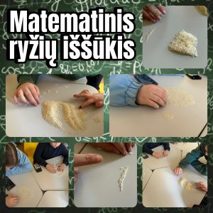 Būrelio „Matematika kitaip“ metu mokiniai atliko smagų ir didelio kruopštumo reikalaujantį eksperimentą. Jie bandė išsiaiškinti, kiek ryžių grūdelių telpa 100 g pakuotėje. Pasidalinę po saujelę mokiniai kantriai skaičiavo. Suskaičiavo net 4887 ryžius. Vėliau rezultatus palygino su dirbtinio intelekto pateikta informacija, kur minima apie 5000 grūdelių. Atlikę eksperimentą mokiniai suprato, kad net ir paprastas produktas gali tapti įdomiu tyrimo objektu, o matematika – puiki priemonė tikrinti, lyginti ir kelti klausimus.