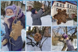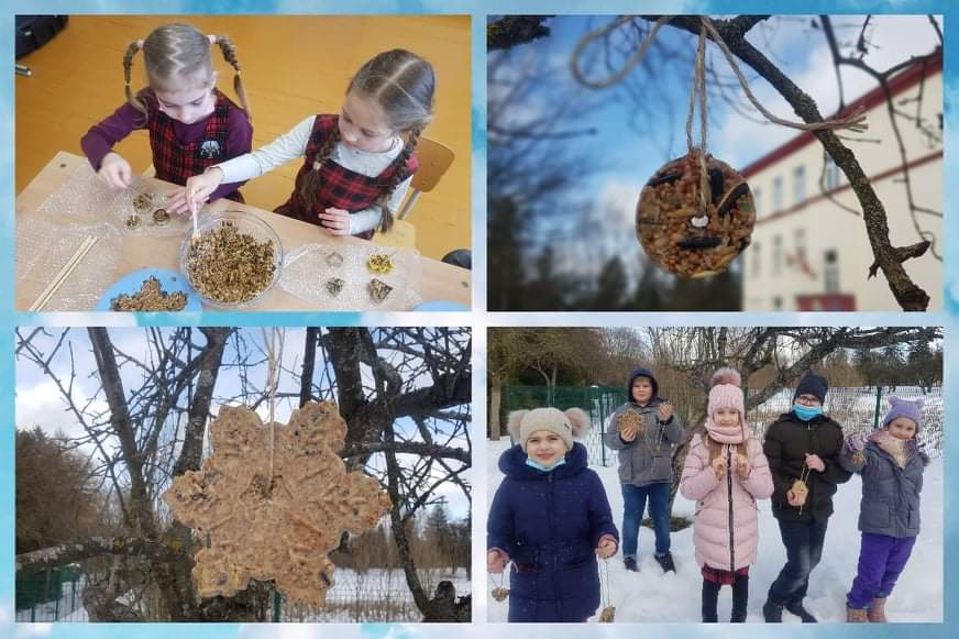 2a ir 4a klasių mokiniai pagamino paukščiams tikrus „pyragėlius“. Dideliame inde ištirpino riebalus, tuomet į juos subėrė pasirinktus priedus (kruopas, sėklas ir kt.), supylė į formeles ir paliko šaldiklyje sustingti. Sukietėjusius „pyragėlius“ pakabino lauke.