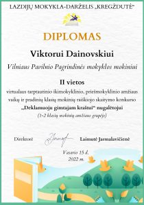 Vilniaus Pavilnio pagrindinės mokyklos 1 B klasės mokinys Viktoras Dainovskis užėmė II prizinę vietą 1-2 klasių amžiaus grupėje. Sveikiname!