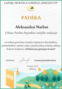 Įvyko Virtualus tarptautinis ikimokyklinio, priešmokyklinio amžiaus vaikų ir pradinių klasių mokinių raiškiojo skaitymo konkursas „Deklamuoju gimtajam kraštui“. Jis buvo skirtas Vasario 16-ajai, Lietuvos valstybės atkūrimo dienai, paminėti. Konkurso tikslas – ugdyti mokinių kūrybiškumą, pilietiškumą, raiškos gebėjimus, sceninę kultūrą.
