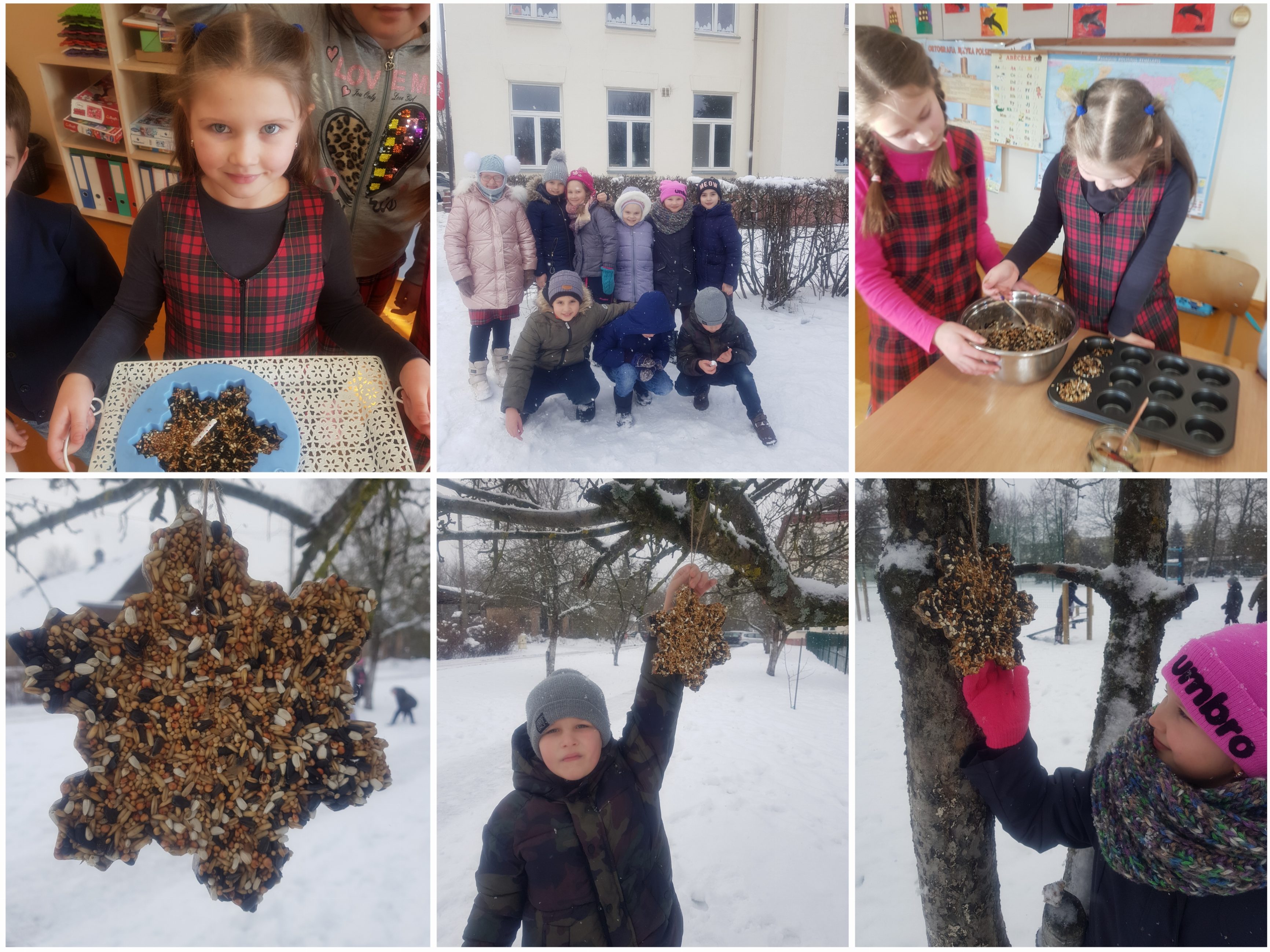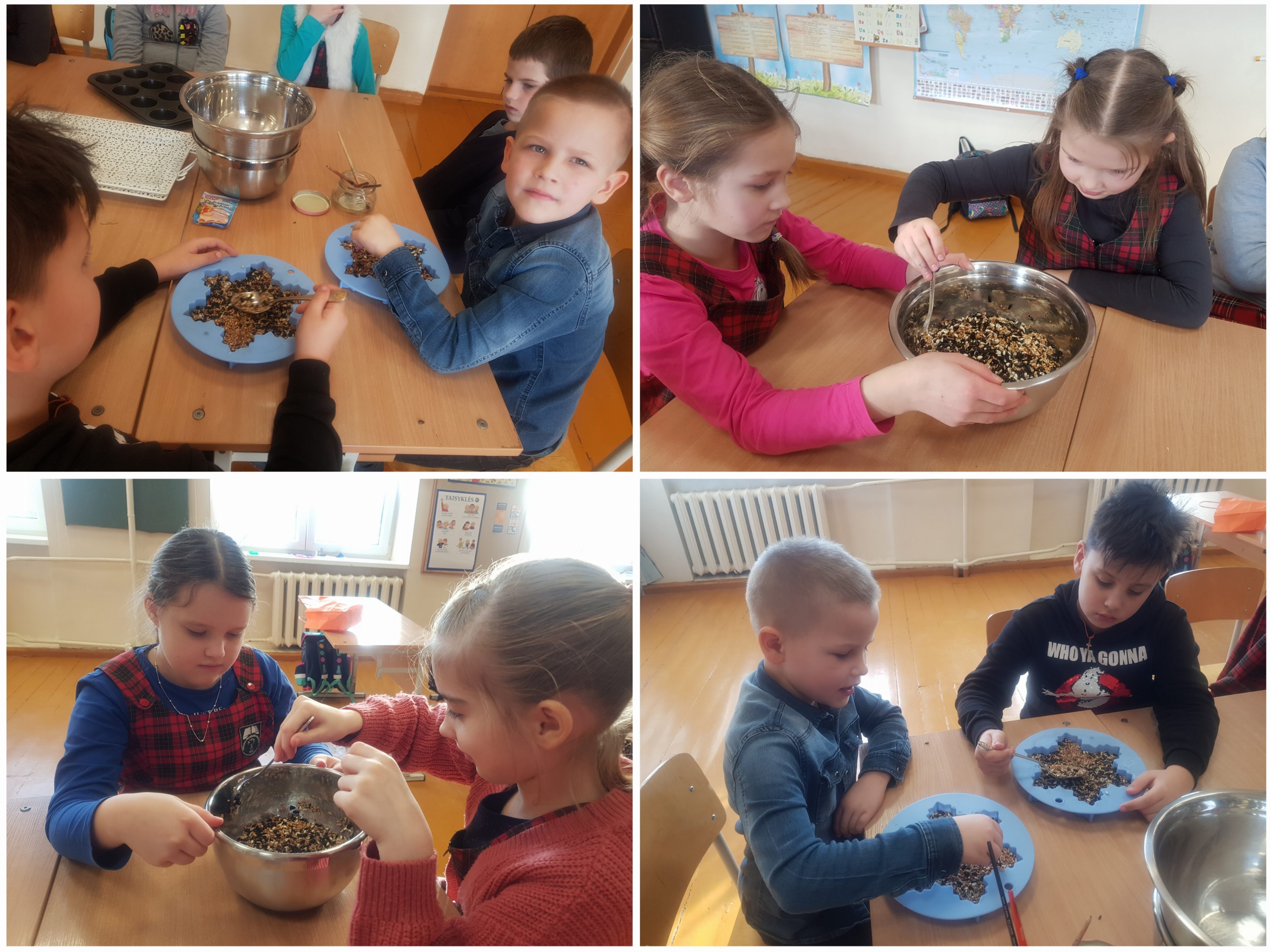 Žiema – tikras išbandymas paukščiams. Bet mūsų mokyklos kieme esančios lesyklos jiems yra ir džiaugsmas, ir išsigelbėjimas. O mokiniams tai mielas ir pažintinis užsiėmimas. 1a ir 3a klasių mokiniai pagamino paukščiams tikrus „pyragėlius“. Dideliame inde ištirpino želatiną, tuomet subėrė pasirinktus priedus (kruopas, sėklas ir kt.), supylė į formeles ir paliko šaldytuve sustingti. Sukietėjusius „pyragėlius“ pakabino lauke. Paukščiai būtų dėkingi už bet kokiais kruopas, o čia tokios vaišės! Vaikams tai džiaugsmas, begalinis džiaugsmas, gėrėtis sparnuočiais, apsilankančiais mūsų lesyklose. Dėkingi paukščiai džiugins mus savo balsais.