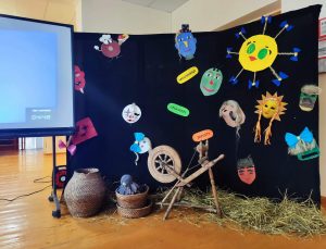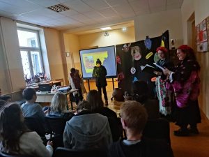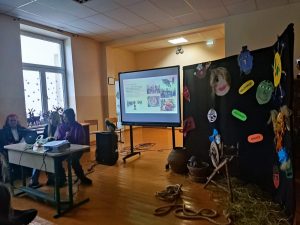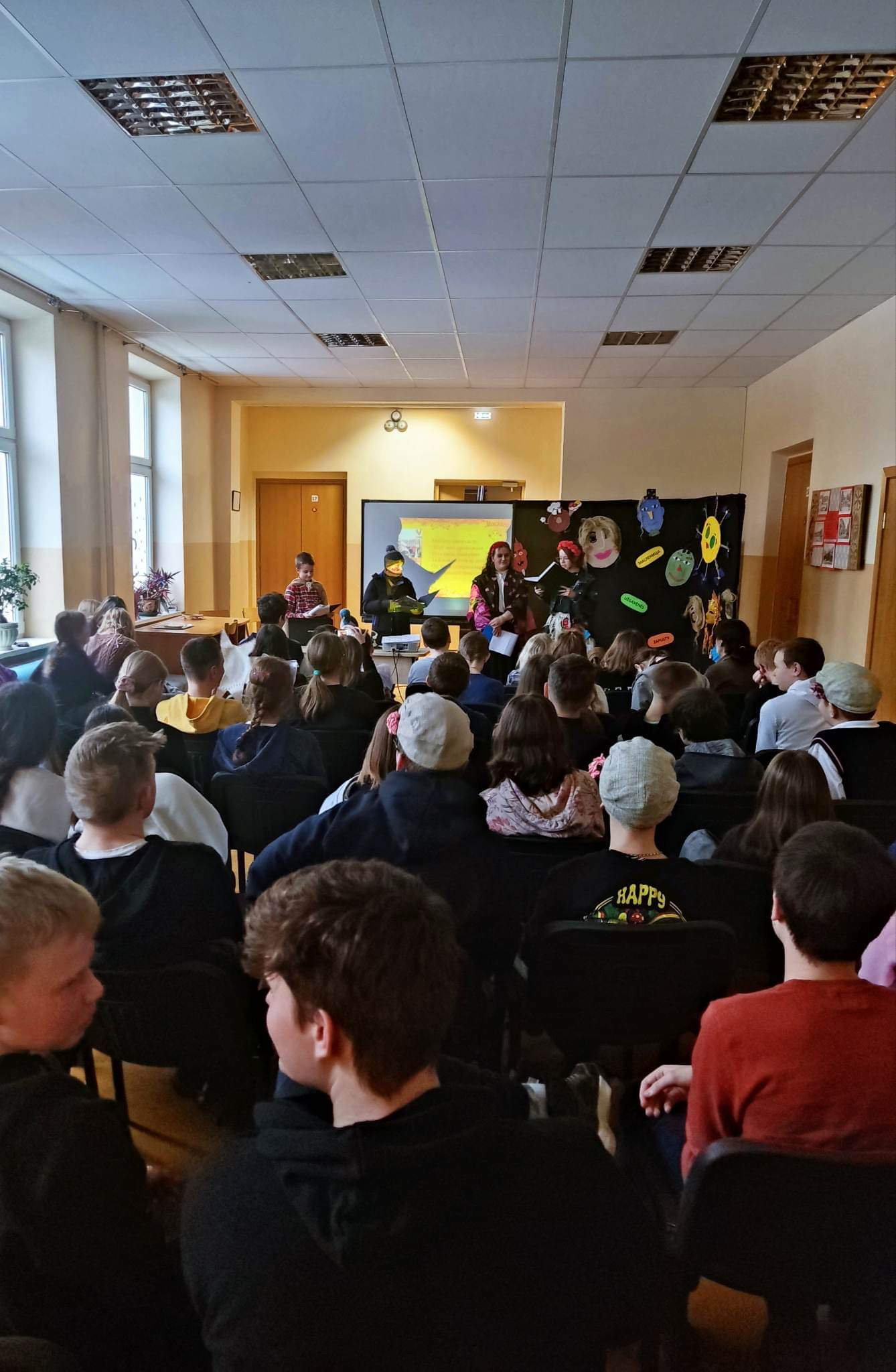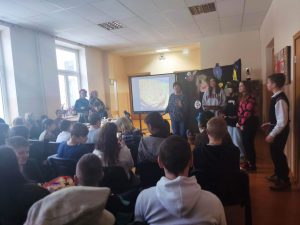 Pasibaigus pamokoms visi susirinkome II aukšto fojė, kur 7b, 8b ir 9a klasių mokiniai pristatė savo paruoštas prezentacijas apie Užgavėnių tradicijas, įdomybes ir žaidimus Lietuvoje, Lenkijoje, Baltarusijoje, Rusijoje, Ukrainoje. Svarbi šventės dalis – Lašininio bei Kanapinio dvikova, kuri simbolizuoja nenorinčios pasitraukti žiemos kova su pavasariu. Kanapinis su Lašininiu paprastai stumdosi, grumiasi, kol galiausiai Kanapinis nugali. Šaunų vaidinimą mums surengė 6b klasės moksleiviai.